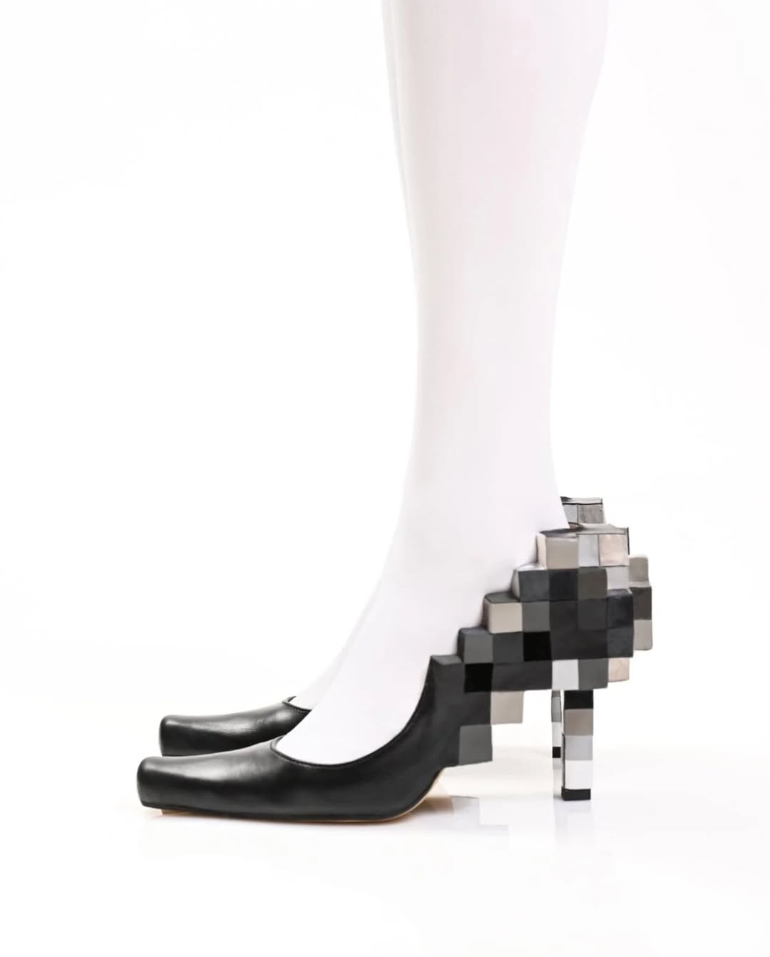 일상적 오브제를 신발에 녹여낸 커스텀 핸드메이드로 AI로 제작한 듯한 비주얼을 선사합니다. 머리와 함께 고장난 발걸음처럼 느껴지는 구두는 로딩 중이거나 입력 오류로 픽셀화되기 마련.