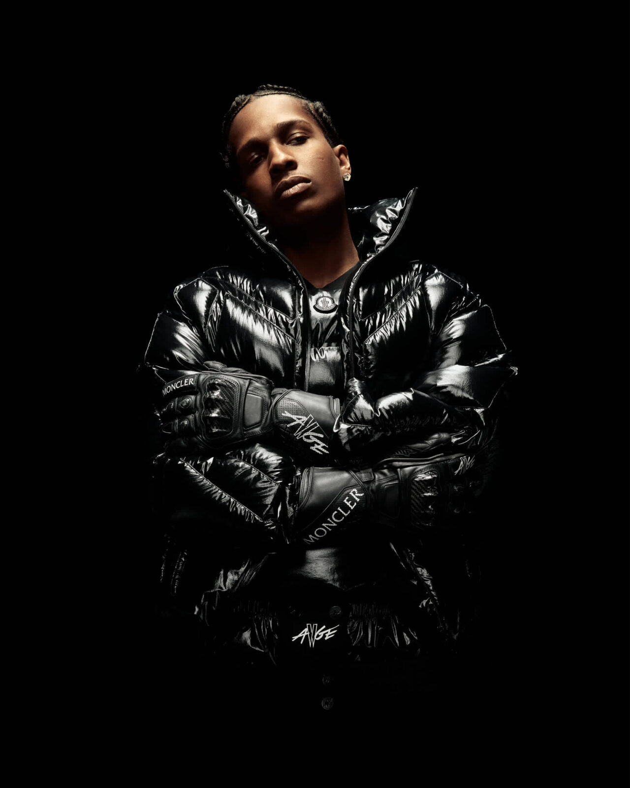 그의 새 앨범 제목 ‘Don’t Be Dumb’가 패치로 새겨지고, AWGE와 몽클레르 로고는 레이어드 웨이스트 밴드 팬츠에서 강렬한 존재감을 드러냅니다.